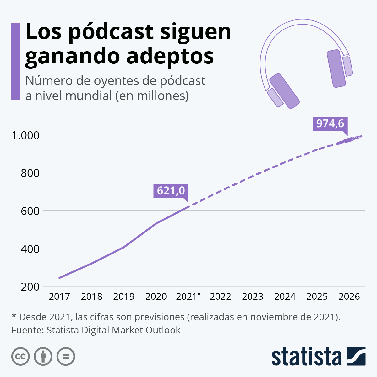 El crecimiento es evidente y se espera que siga en aumento en los próximos años. Statista preveé que, en 2026, casi mil millones de personas escuchen podcasts. Una tendencia al alza con la que la propia Revista Forbes considera que las publicaciones web adoptarán también el formato en sus entradas.